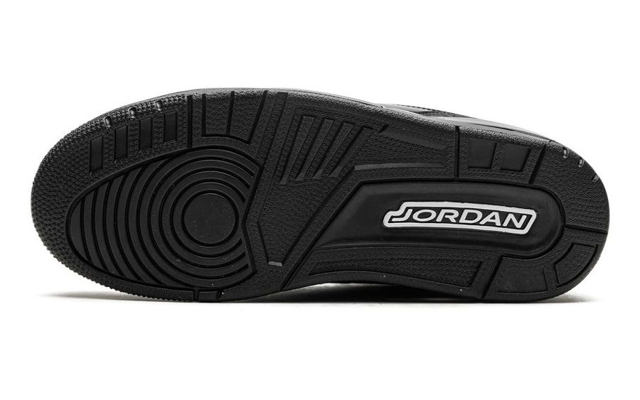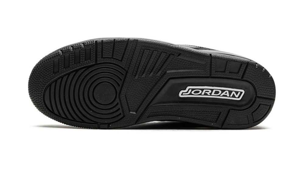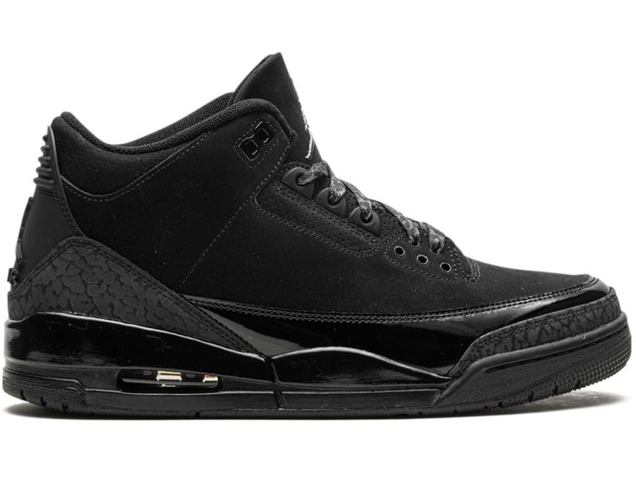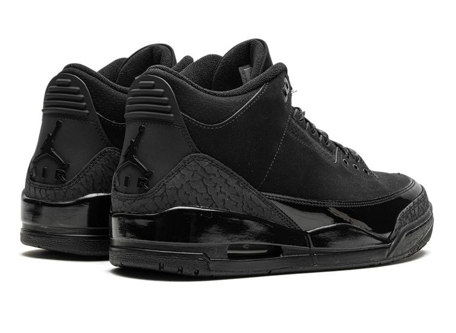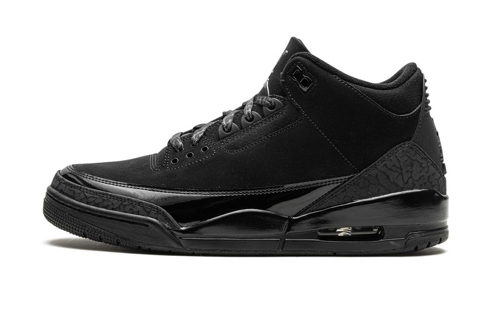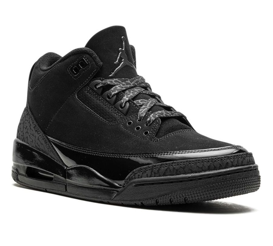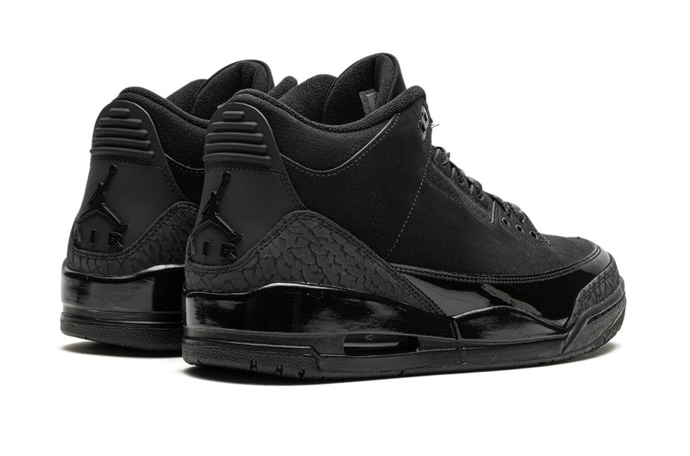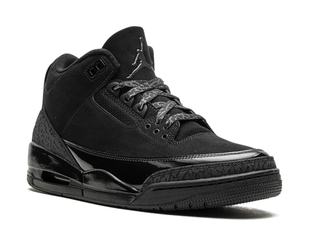 Adorned in a sleek Black and Dark Charcoal palette, the Air Jordan 3 boasts a nubuck upper, elephant print, and patent leather overlays. The all-Black design dominates, save for the White Jordan branding on the outsole. The laces, featuring the iconic elephant print, contribute to the overall thematic coherence. A solid Black rubber sole with visible Air units in the heels seals the deal.