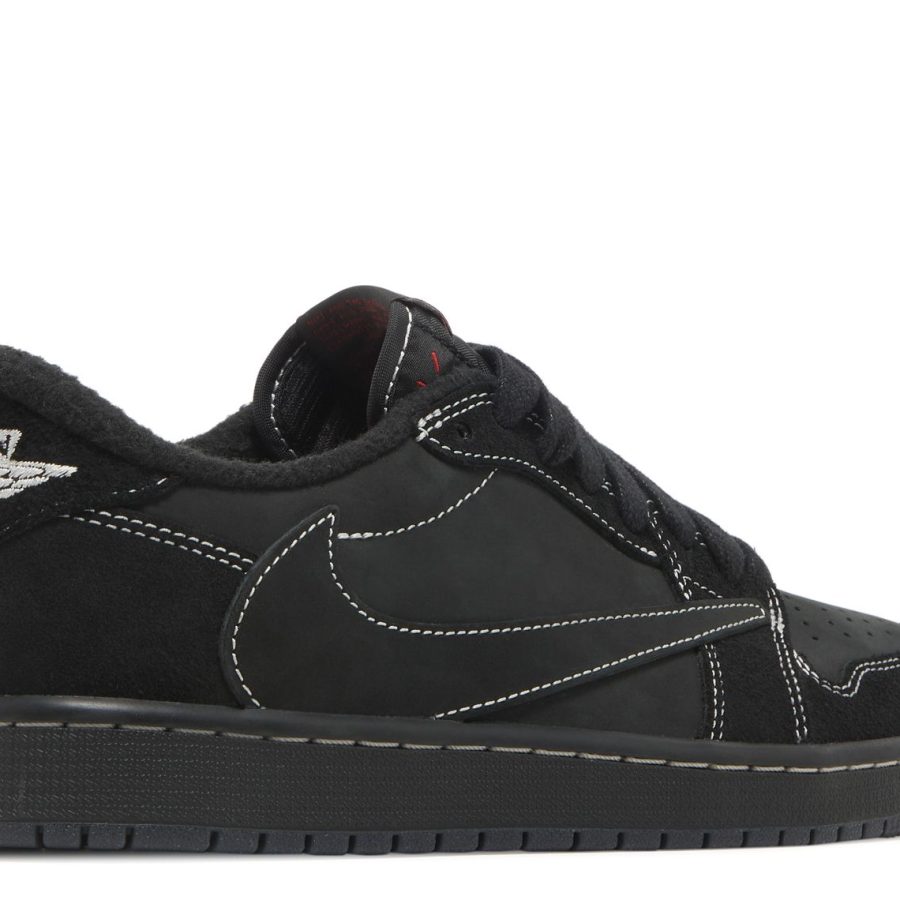 The Travis Scott x Air Jordan 1 Retro Low OG SP ‘Black Phantom’ sees the Houston-based rapper color up another AJ1 Low. This iteration features a blacked-out look, with nubuck and suede on the upper underscored by white contrast stitching throughout. Scott’s signature reverse Swoosh remains, alongside a regular Swoosh on the medial side with Cactus Jack branding. The back heel features mismatched branding, with a Wings logo on the right shoe and a bee graphic on the left.