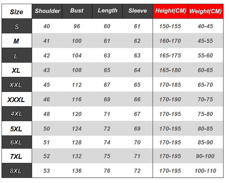 Size | S, M, L, XL, 2XL, 3XL, 4XL, 5XL, 6XL, 7XL, 8XL |
